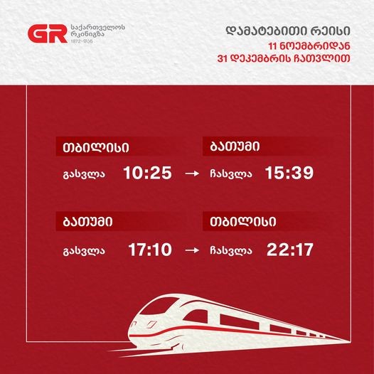 საქართველოს რკინიგზა 11 ნოემბრიდან 31 დეკემბრის ჩათვლით, ბათუმის მიმართულებით დამატებით რეისებს ნიშნავს - ამის შესახებ ინფორმაციას საქართველოს რკინიგზა ავრცელებს.