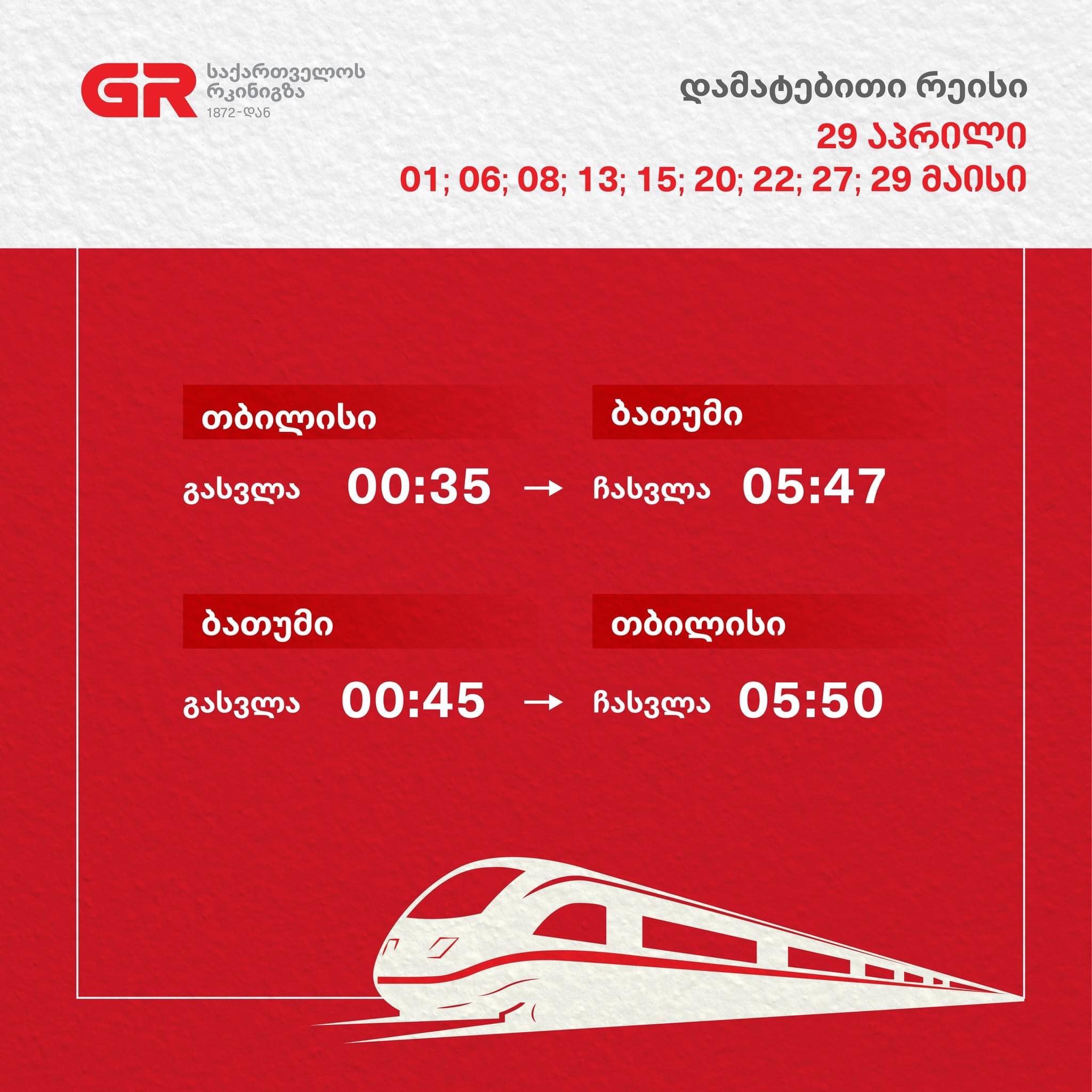 საქართველოს რკინიგზა ბათუმის მიმართულებით დამატებით რეისებს ნიშნავს - ინფორმაციას „საქართველოს რკინიგზა“ ავრცელებს.