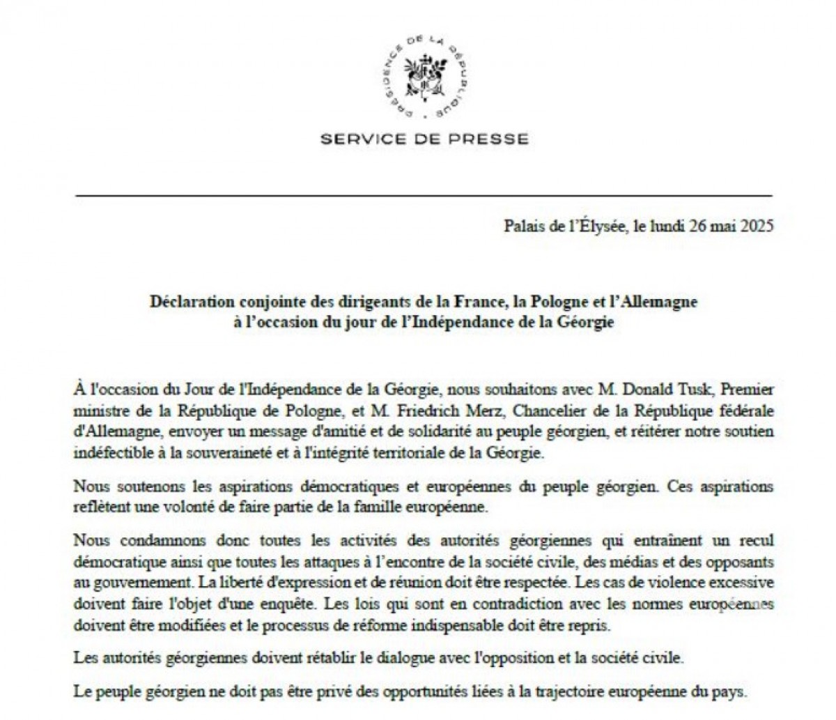 „საქართველოს დამოუკიდებლობის დღესთან დაკავშირებით, გვსურს, ბატონ დონალდ ტუსკთან, პოლონეთის რესპუბლიკის პრემიერ-მინისტრთან და ბატონ ფრიდრიხ მერცთან, გერმანიის ფედერაციული რესპუბლიკის კანცლერთან ერთად, ქართველ ხალხს მეგობრობისა და სოლიდარობის გზავნილი გავუგზავნოთ და კიდევ ერთხელ გავიმეორთ ჩვენი ურყევი მხარდაჭერა საქართველოს სუვერენიტეტისა და ტერიტორიული მთლიანობის მიმართ. ჩვენ მხარს ვუჭერთ ქართველი ხალხის დემოკრატიულ და ევროპულ მისწრაფებებს. ეს მისწრაფებები ასახავს ევროპული ოჯახის წევრობის სურვილს. შესაბამისად, ჩვენ ვგმობთ საქართველოს ხელისუფლების ყველა ქმედებას, რომელიც იწვევს დემოკრატიულ უკუსვლას, ისევე როგორც სამოქალაქო საზოგადოების, მედიისა და მთავრობის ოპონენტების წინააღმდეგ ყველა თავდასხმას. გამოხატვისა და შეკრების თავისუფლება უნდა იყოს დაცული. გადაჭარბებული ძალადობის შემთხვევები უნდა იქნეს გამოძიებული. კანონები, რომლებიც ეწინააღმდეგება ევროპულ ნორმებს, უნდა შეიცვალოს, ხოლო საჭირო რეფორმების პროცესი განახლდეს. საქართველოს ხელისუფლებამ უნდა აღადგინოს დიალოგი ოპოზიციასა და სამოქალაქო საზოგადოებასთან. ქართველ ხალხს არ უნდა წაერთვას ქვეყნის ევროპულ ტრაექტორიასთან დაკავშირებული შესაძლებლობები“, - ნათქვამია განცხადებაში.