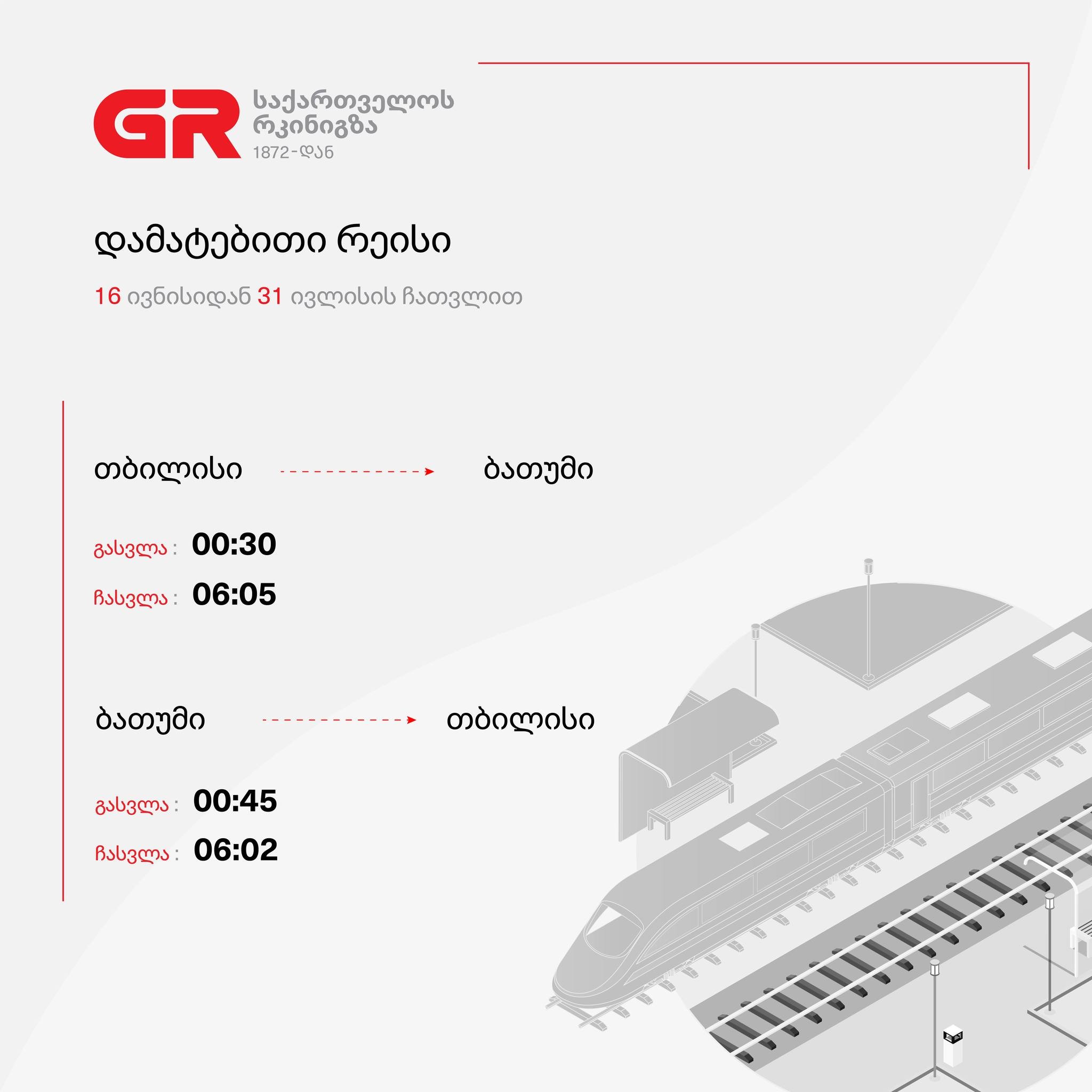 გაზრდილი მგზავრთნაკადის გამო, საქართველოს რკინიგზა 16 ივნისიდან 31 ივლისის ჩათვლით, თბილისი-ბათუმი-თბილისის მიმართულებით რეისებს ამატებს.