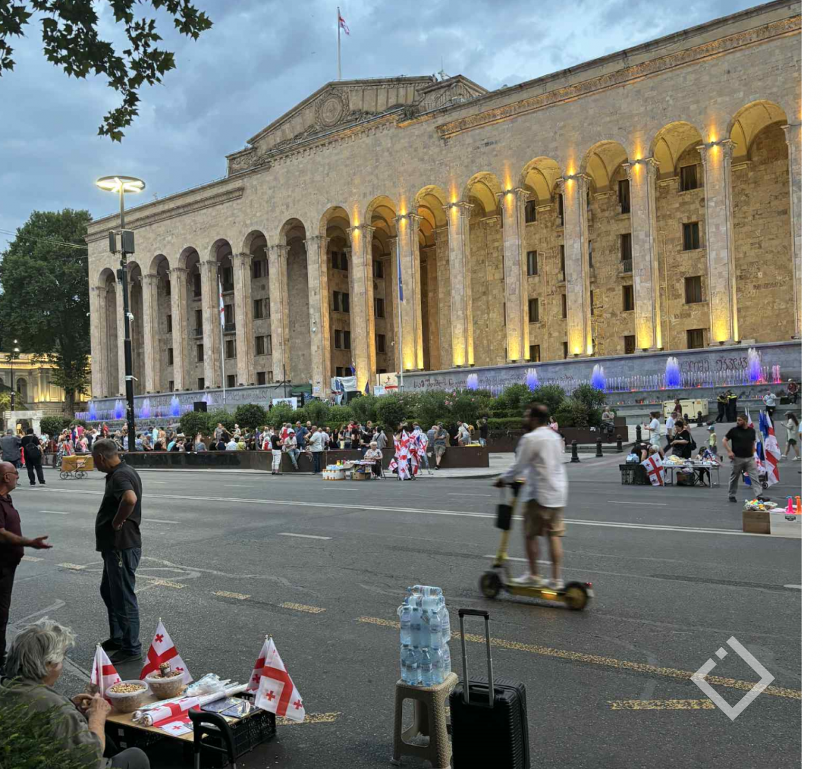 აქციის მონაწილეები თბილისის სახელმწიფო უნივერსიტეტიდან მსვლელობით საკანონმდებლო ორგანოსკენ მიემართებიან.
