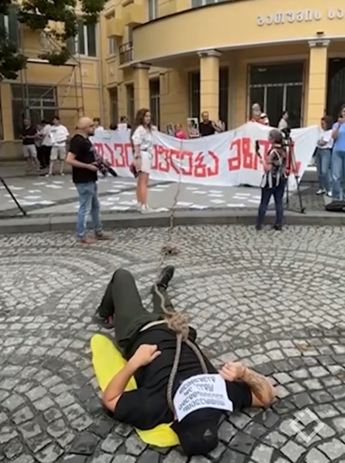 ბათუმის საქალაქო სასამართლოსთან მზია ამაღლობელის დასკვნითი სასამართლო სხდომის დაწყებამდე ერთ-ერთმა აქტივისტმა პერფორმანსი მოაწყო.