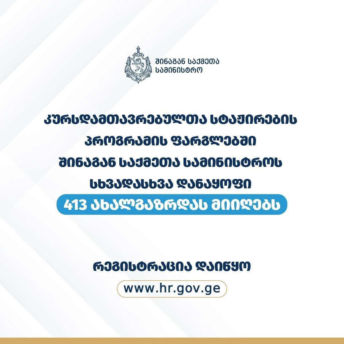 აღნიშნული პროგრამის ფარგლებში, 413 პირს შესაძლებლობა ექნება ანაზღაურებადი სტაჟირება გაიაროს შინაგან საქმეთა სამინისტროს სხვადასხვა დანაყოფში.