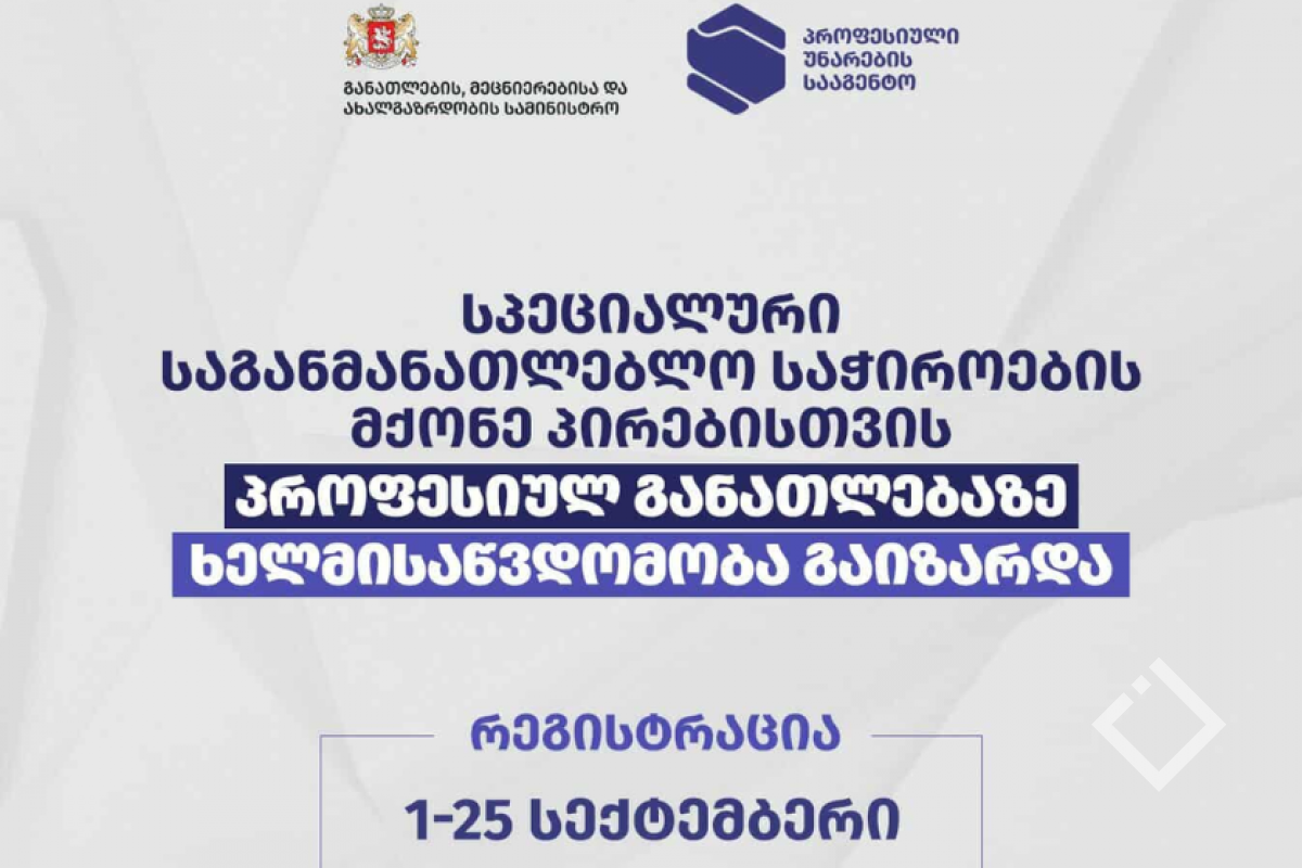 ახალი მხარდამჭერი სისტემის ფარგლებში, ყველა პროფესიული საგანმანათლებლო პროგრამა, სპეციალური საგანმანათლებლო საჭიროების მქონე პირებისთვის სრულად ხელმისაწვდომია და რეგისტრაციის გავლა 1 სექტემბრიდან 25 სექტემბრის ჩათვლით ონლაინ, ვებგვერდზე - https://vet.emis.ge/#/ შეეძლებათ.