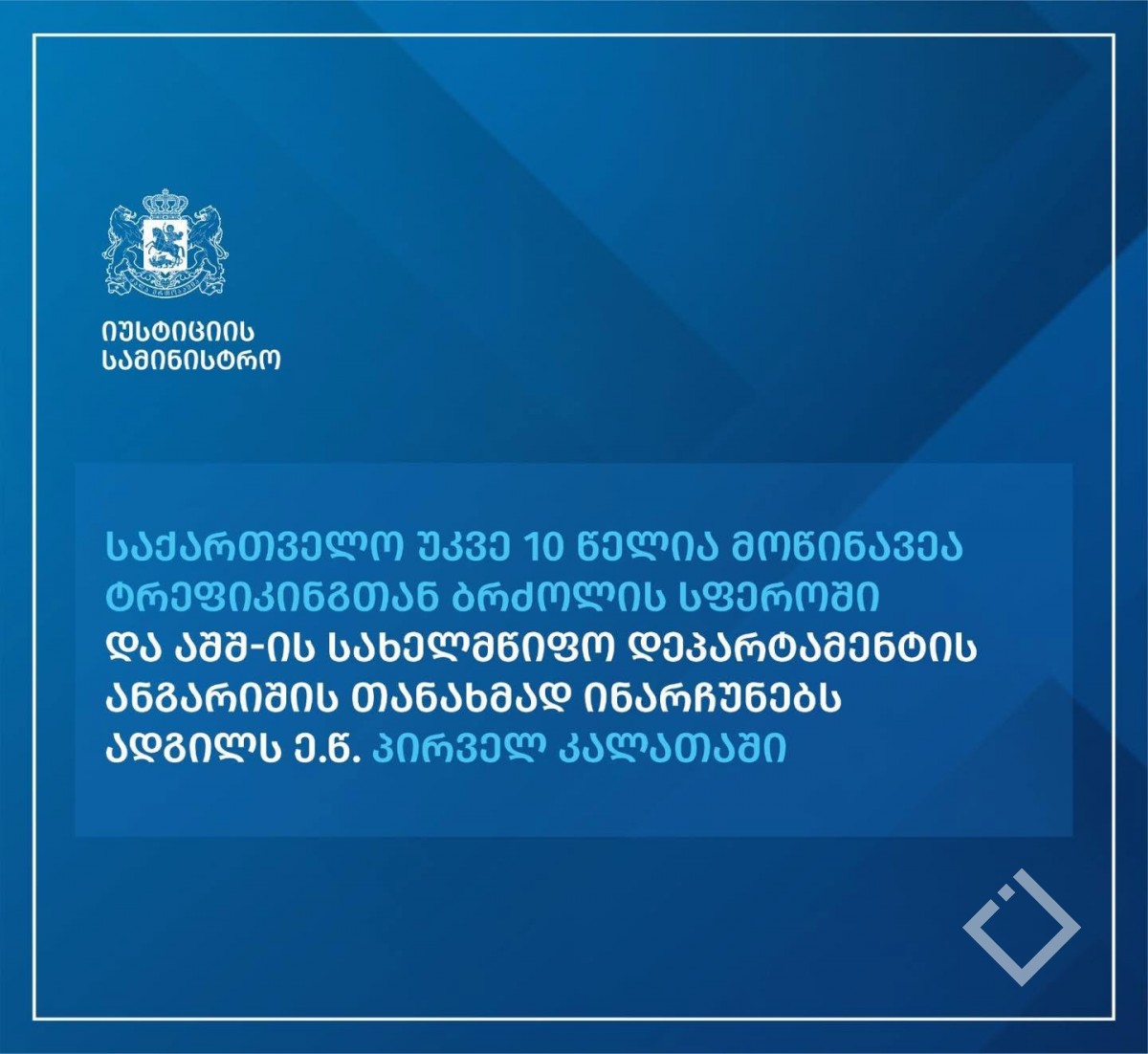 " აშშ-ის სახელმწიფო დეპარტამენტის ანგარიშში ხაზგასმულია ადამიანით ვაჭრობის (ტრეფიკინგის) წინააღმდეგ ბრძოლის ყველა მიმართულებით საქართველოს მთავრობის მიერ გაძლიერებული ძალისხმევა როგორც დანაშაულის პრევენციის, ისე დამნაშავეთა გამოვლენის, დასჯისა და მსხვერპლთა დაცვის მიმართულებით.