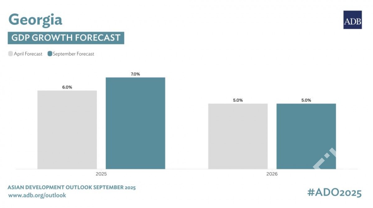 მათივე ცნობით, აზიის განვითარების პროგნოზის 2025 წლის სექტემბრის ანგარიში, ADB-ის მთავარი ყოველწლიური ეკონომიკური პუბლიკაცია, პროგნოზირებს, რომ საქართველოს მთლიანი შიდა პროდუქტი (მშპ) 2025 წელს 7.0%-ით გაიზრდება, აპრილში პროგნოზირებული 6.0%-ის ნაცვლად, ხოლო 2026 წელს ზრდა 5.0%-ზე შენარჩუნდება. ანგარიშის თანახმად, ზრდას ხელს უწყობს მომსახურების, ინფორმაციისა და კომუნიკაციის დარგებში ძლიერი მაჩვენებლები, რაც ინფორმაციული ტექნოლოგიების მაღალ პროდუქტიულობას ასახავს, ასევე – კერძო მოხმარების მდგრადობა და უცხოელი ინვესტორების გაორმაგებული რეინვესტირება.