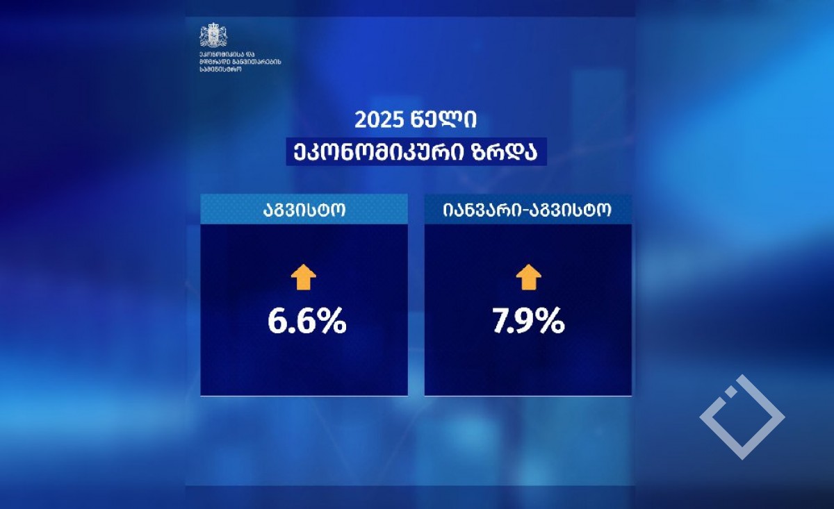 უწყების ცნობით, 2025 წლის პირველ კვარტალში ეკონომიკური ზრდა 9.8% იყო, მეორე კვარტლის ზრდა 7.3%-ს გაუტოლდა, ივლისში ეკონომიკურმა ზრდამ 6.5%, ხოლო აგვისტოში 6.6% შეადგინა. აღსანიშნავია, რომ 2025 წლის იანვარ-აგვისტოს საშუალო ეკონომიკური ზრდა 7.9%-ით განისაზღვრა.