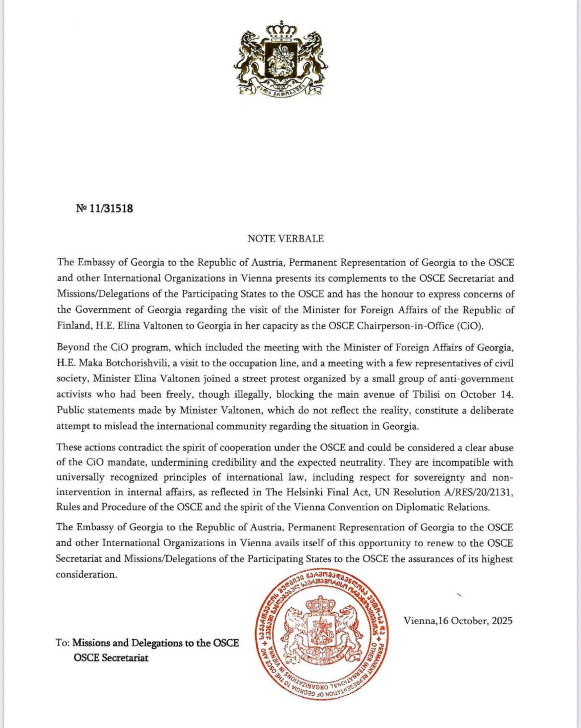 „საქართველოს საელჩო ავსტრიის რესპუბლიკაში და მუდმივი წარმომადგენლობა ეუთო-სა და ქ. ვენაში სხვა საერთაშორისო ორგანიზაციებში გამოხატავს თავის ღრმა  პატივისცემას ეუთო-ს სამდივნოს მიმართ და აქვს პატივი, გამოხატოს საქართველოს მთავრობის შეშფოთება ფინეთის რესპუბლიკის საგარეო საქმეთა მინისტრის ელინა ვალტონენის, როგორც ეუთო-ს მოქმედი თავმჯდომარის საქართველოში ვიზიტთან დაკავშირებით.