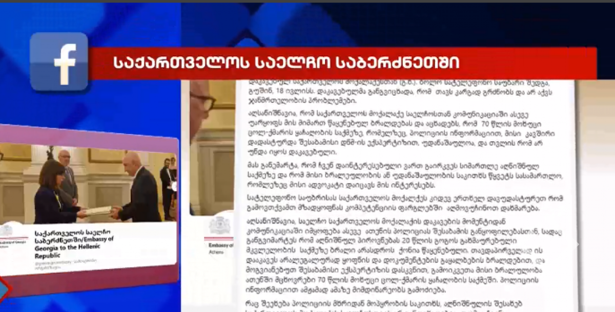 საბერძნეთში, 70 წლის მოხუცი ცოლ-ქმრის ყაჩაღობის ბრალდებით დაკავებული ქართველის საქმეზე საქართველოს საელჩო განცხადებას ავრცელებს. განცხადებაშია აღნიშნულია, რომ საელჩო მუდმივ კომუნიკაციაშია საბერძნეთში დაკავებულ საქართველოს მოქალაქესთან და მასთან ბოლო სატელეფონო საუბარი გუშინ შედგა.