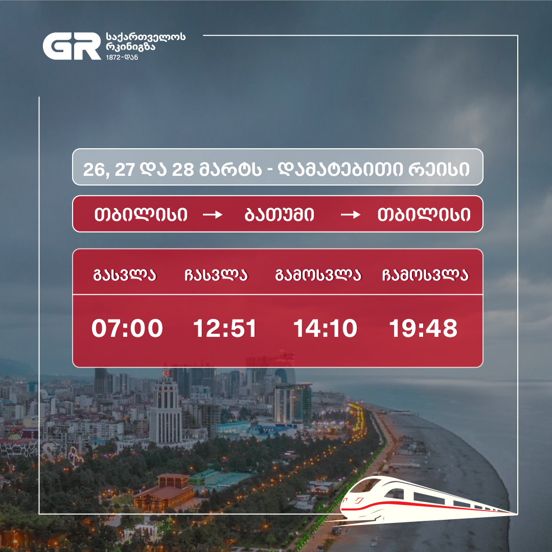 ​მატარებელი თბილისიდან ბათუმის მიმართულებით 07:00 საათზე გავა, ბათუმიდან კი რეისი 14:10 წუთზე შესრულდება.