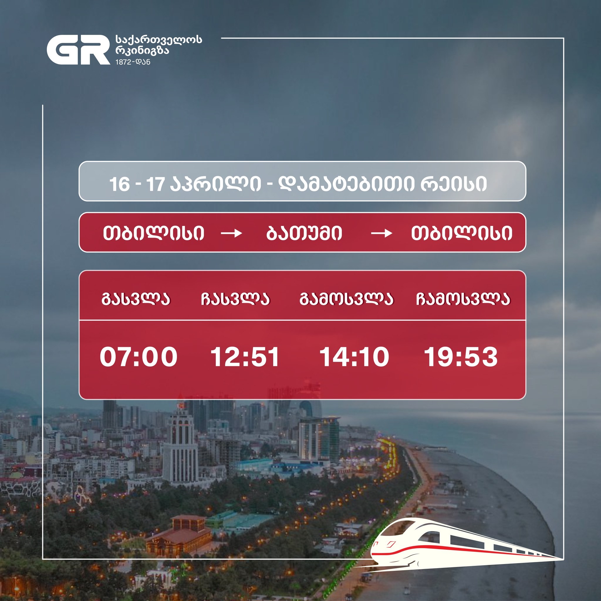 „გაზრდილი მგზავრთნაკადის გამო, საქართველოს რკინიგზა 16 და 17 აპრილს ბათუმის მიმართულებით დამატებით რეისებს ნიშნავს. მატარებლის მოძრაობის განრიგი იხილეთ თანდართულ ცხრილში“, – აღნიშნავენ „საქართველოს რკინიგზაში“.